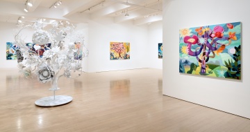 Chie Fueki, a recent recipient of the Guggenheim Fellowship, is known for her singular, striking paintings that explore memory and longing. Her current paintings collapse time and place, portraiture and landscape, creating reflective shared spaces animated by light and energy. Drawing on her experience growing up in a Japanese community in São Paolo, Brazil, Fueki synthesizes art historical languages, culturally-coded signifiers, and personal emblems. Layering cut and painted papers, Fueki’s complex, tactile surfaces create a nuanced interplay between the viewer and the painting: “While I invite the viewer to participate in building associations and meaning through the forms depicted on my surfaces, I also want them to feel the weight of the wooden panel on the wall, the size of the painting-support about their body, and the surfaces that refract, absorb light, shine and reflect at them. In the mid-19th century, the philosopher Robert Vischer invented the term Einfühlung or empathy theory. He wrote that a viewer unconsciously projects its bodily form––and with this also the soul––into the form of the object.”
