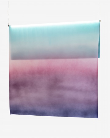 Kiah Celeste’s practice is made up of materials and objects gleaned from urban and industrial contexts, repurposed and combined in sculptures and installations with a post-minimalist bend. Her latest body of work takes on a pared down, yet striking, form: monochromatic pieces of spandex, stretched in poplar frames and installed on the gallery’s walls, playfully incorporate a set of found materials. Extending well beyond the frame to rest on the floor, a large piece of Corian towers within Distent. In Skydrool, a used paint bucket emerges from the center of another frame. Little Apple of Paradise’s frayed bungee cord maintains tension between a cream field of fabric and glass that rests against the floor. Installed bridging a corner, Four Shores’ frames hold plastic cords in tension.