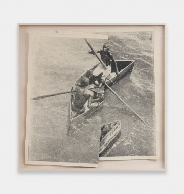 Likewise taking familial ephemera as a point of departure are Samira Yamin’s Entrainment Exercises (2023), unique prints developed from a series of negatives the artist received of her paternal grandfather, who was training as a professional gymnast in Iran during the 1950s. Employing a self-developed, analog process by which water ripples over the images as they are being developed. Yamin’s shifts the subject of the images from the individuals pictured to her own psychological processing of these images. Yamin’s re-engagement with the images animates an otherwise untapped connection to her family’s past through this act of image making, that suggests a sense of play, which belies the separation forced by time, space, and migration.