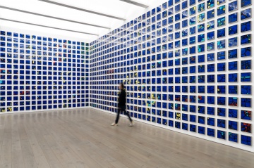 Perrotin is pleased to present Gregor Hildebrandt’s latest exhibition, Blau im Gedächtnis (Blue in Memoriam), inspired by the interior windows of the Kaiser Wilhelm Memorial Church, one of West Berlin’s most famous landmarks. This work transposes the motifs of its stained windows into an installation of small vinyl record paintings that covers the entire exhibition space, creating an immersive experience for the viewer.