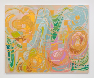 The perpetual grid reappears in the monumental triptych, Addendum (2025), which features richly colored, ribbonlike lines floating over an undulating weave pattern. The spatial relationship between these elements is purposefully ambiguous, straddling planes of indeterminate proximity and depth. Unconstrained by boundary or edge, the ribbons and grid travel across the equidistant gaps separating the panels from one another, casting the connective imagery between each canvas into an unseen presence.