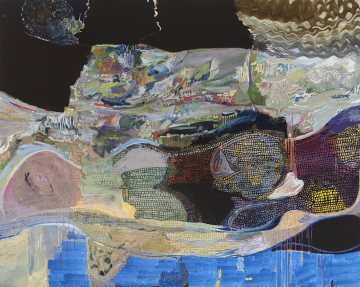 Often beginning with a single horizontal line, Lundsager’s paintings are developed intuitively, though it’s an intuition built on decades of looking, living, and painting. The artist’s first mark determines the next. Accumulations occur, get erased, then reformed as her compositions bloom through her acute attention to and relationship with the material. Large swaths of color buttress against areas of delicate line work, melting into organic forms, evoking rolling hills, still waters and atmosphere, or even plant life. The combination of transcendental images with Lundsager’s expressive mark-making speaks to the complexity of the human experience. In the painting If it (2024), broad and bright brush strokes sweep across the top of the canvas, revealing slivers of another world just beyond the drips. Below the heat of the orange and yellow sweeps of color are two speckled masses that seem to have split apart, one floating in the atmosphere above its counterpart, reminiscent of a parent and child, evolving organisms, or even body and spirit. Eva Lundsager’s paintings are full of possibilities. The artist’s use of movement, form and rhythm in If it (2024) creates space on the painted surface and within the viewer to reflect, contemplate and dream.