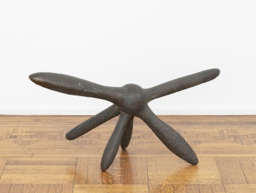 In the 1990s, Outterbridge returned to working with metal and wood, all the while continuing his use of discarded bits of fabric, including bits of torn American flags, important in his works from all periods. Window with Footnote, 1991, a metal wall construction with a recessed “window” in which sits a wooden leg, wrapped in fabric strips, as if to heal an injury. From 2009 to 2012, Outterbridge made a large series of smaller wood and metal sculptures that refer back to instruments of containment as well as healing. I Mus Speak, 2012 in this show contains a small, but complete American flag amidst its otherwise abstract assembled parts.